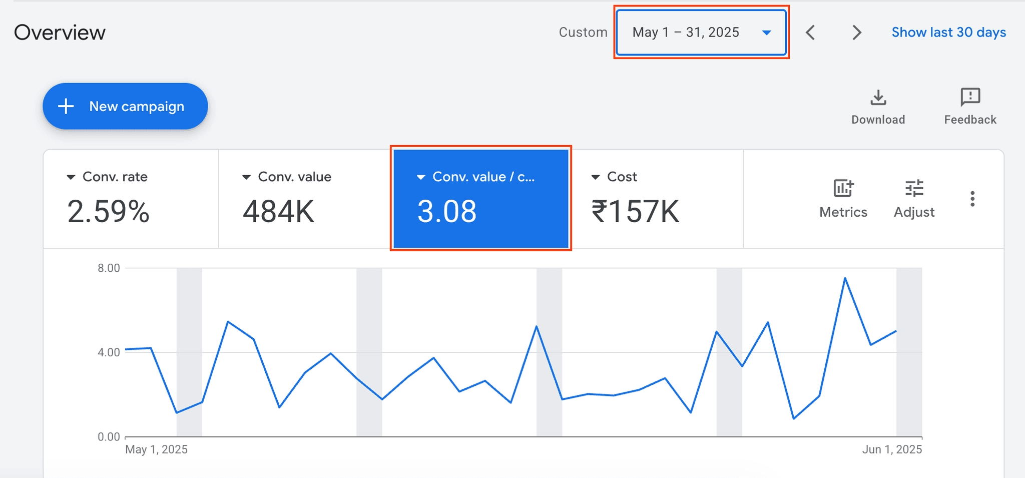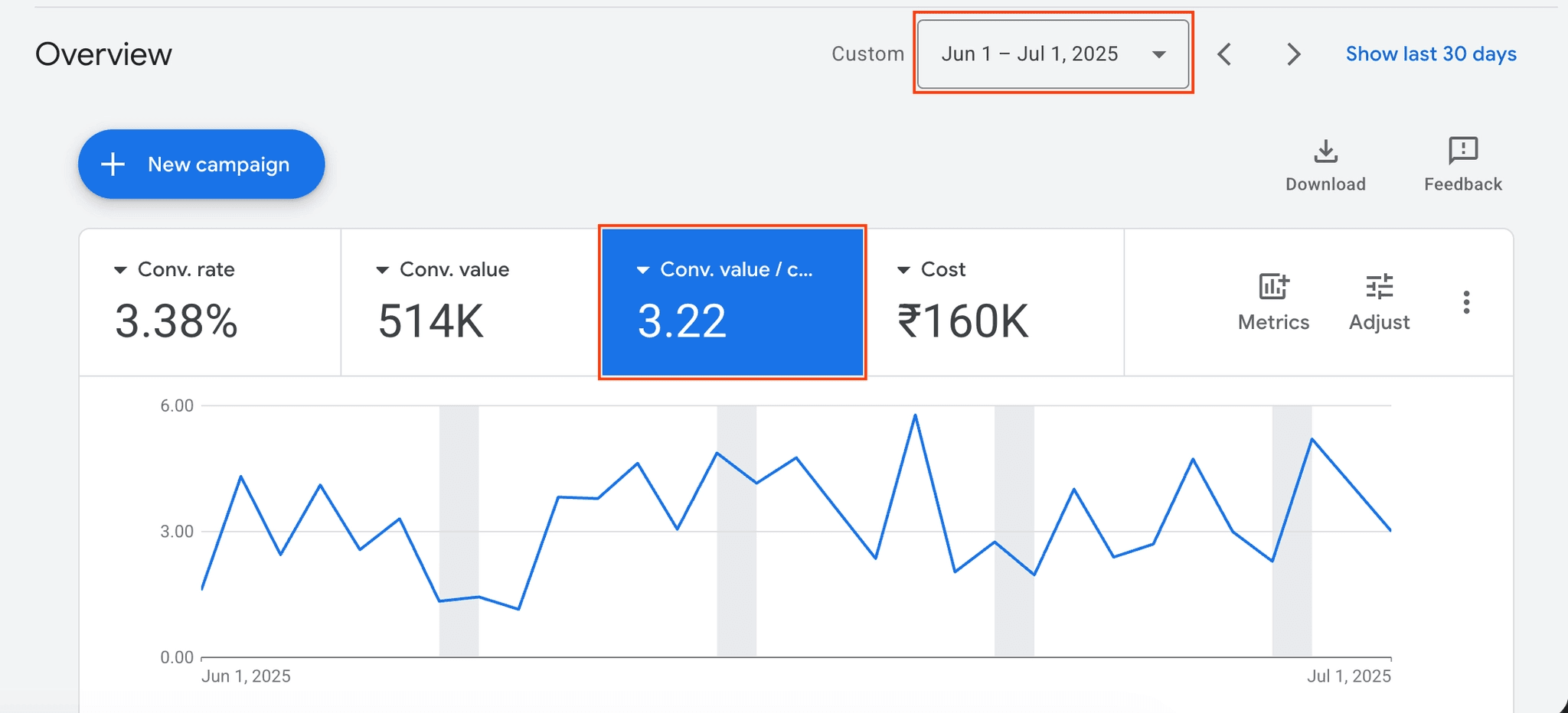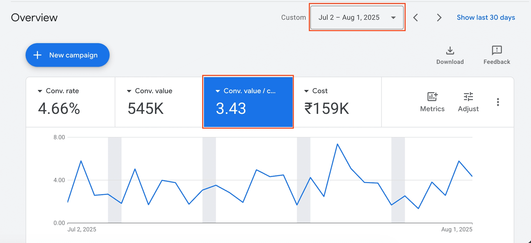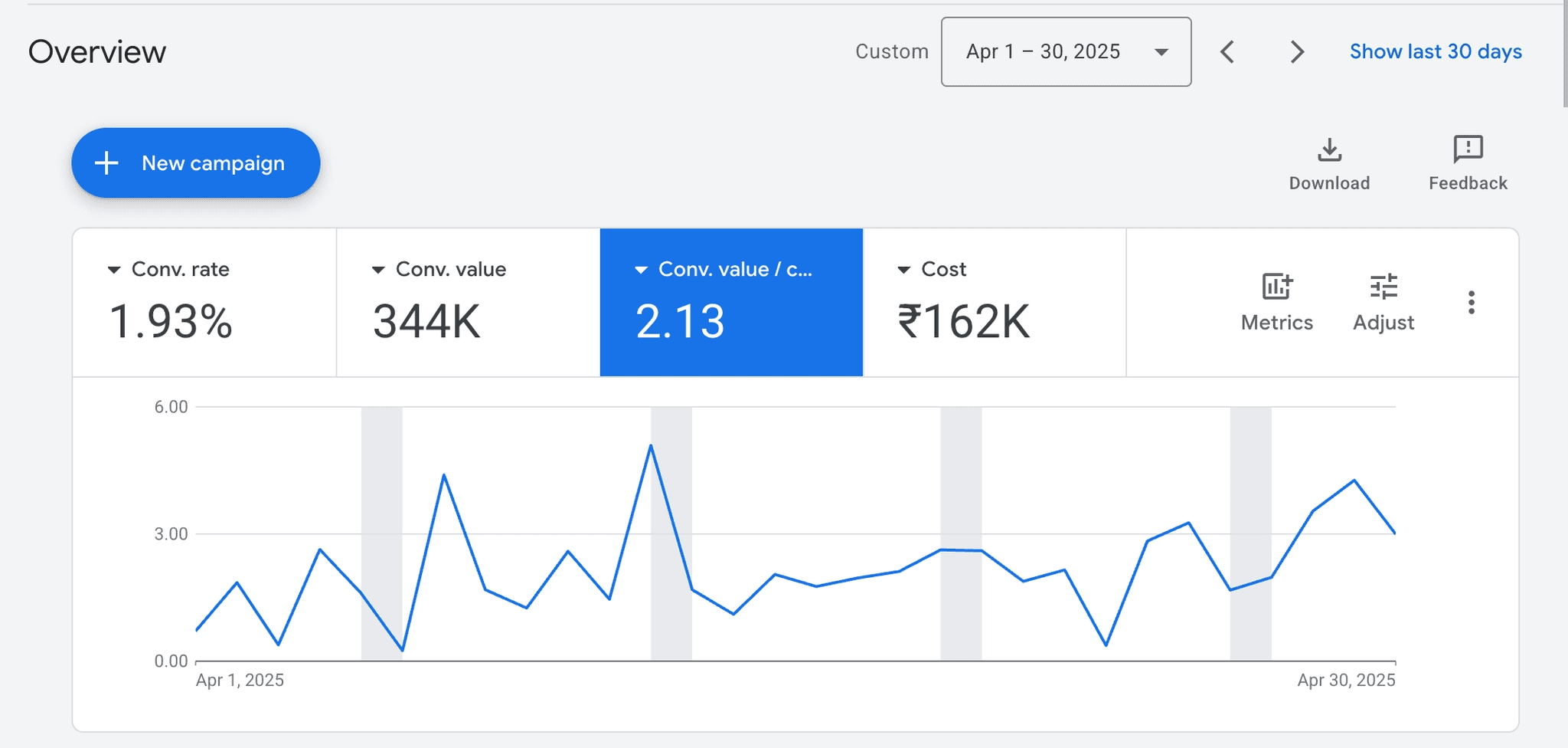 Algorithm stabilises on the right audience. ROAS crosses the 3× threshold for the first time — from within Mumbai city only.