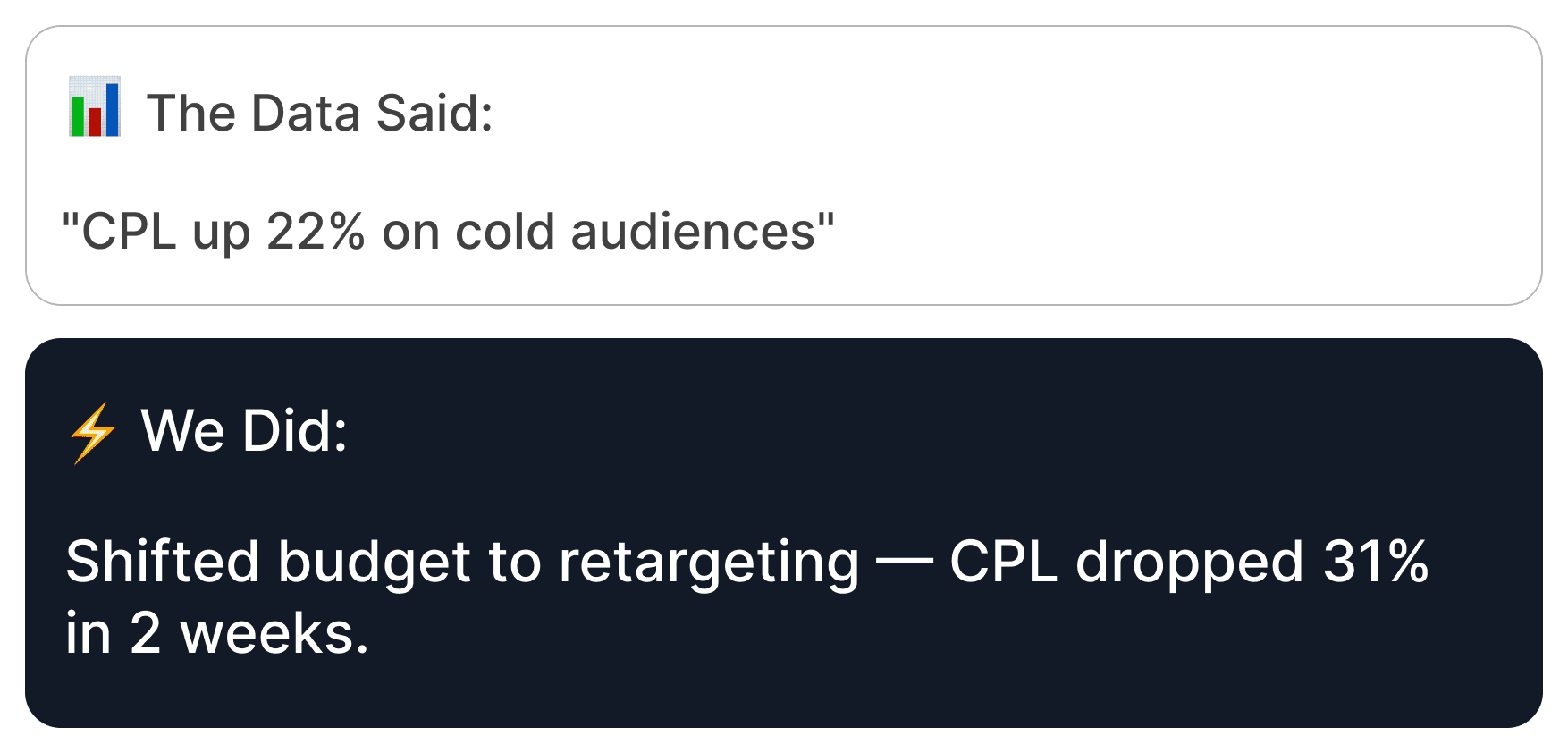 Too many agencies live in spreadsheets and forget that people buy on emotion. We pair real performance data with timeless marketing principles — so your clients get brands that genuinely grow, not just good-looking reports.